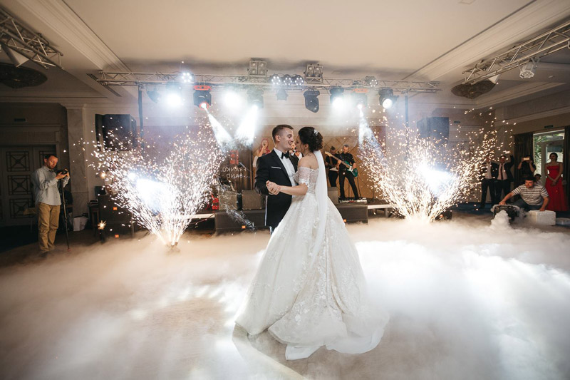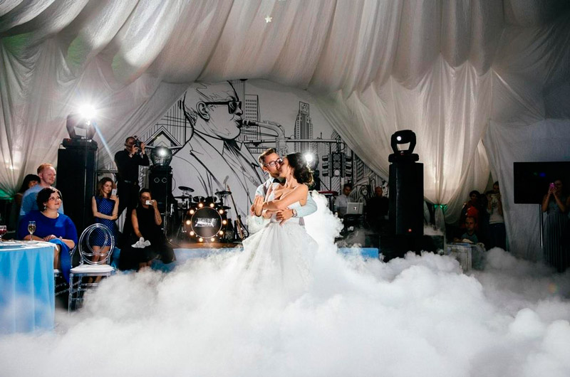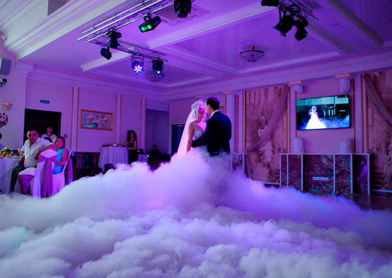 Белые густые клубки дыма для свадебного танца в Саратове. Тяжелый дым стелится на полу, для создания эффекта облаков.